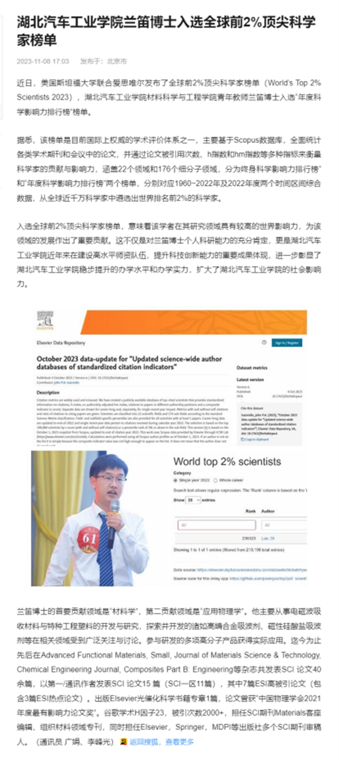 【搜狐】湖北汽车工业学院兰笛博士入选全球前2%顶尖科学家榜单
