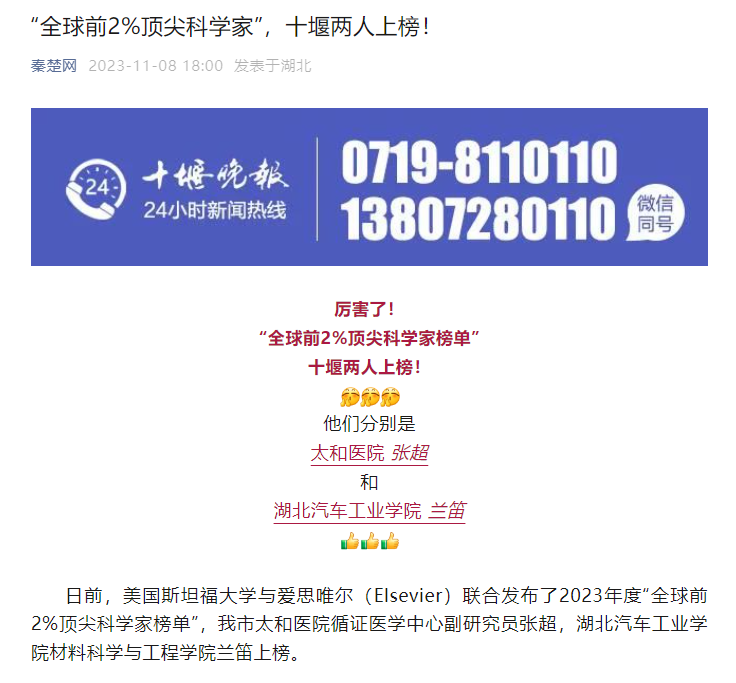 【秦楚网】“全球前2%顶尖科学家”,十堰两人上榜