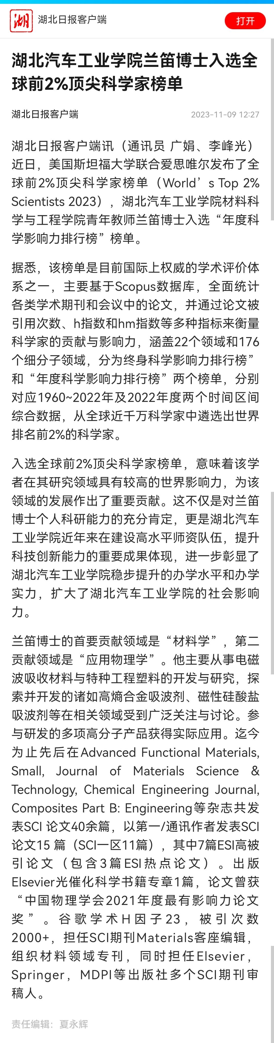 【湖北日报】湖北汽车工业学院兰笛博士入选全球前2%顶尖科学家榜单