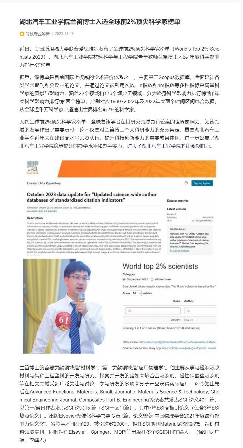 【腾讯】湖北汽车工业学院兰笛博士入选全球前2%顶尖科学家榜单
