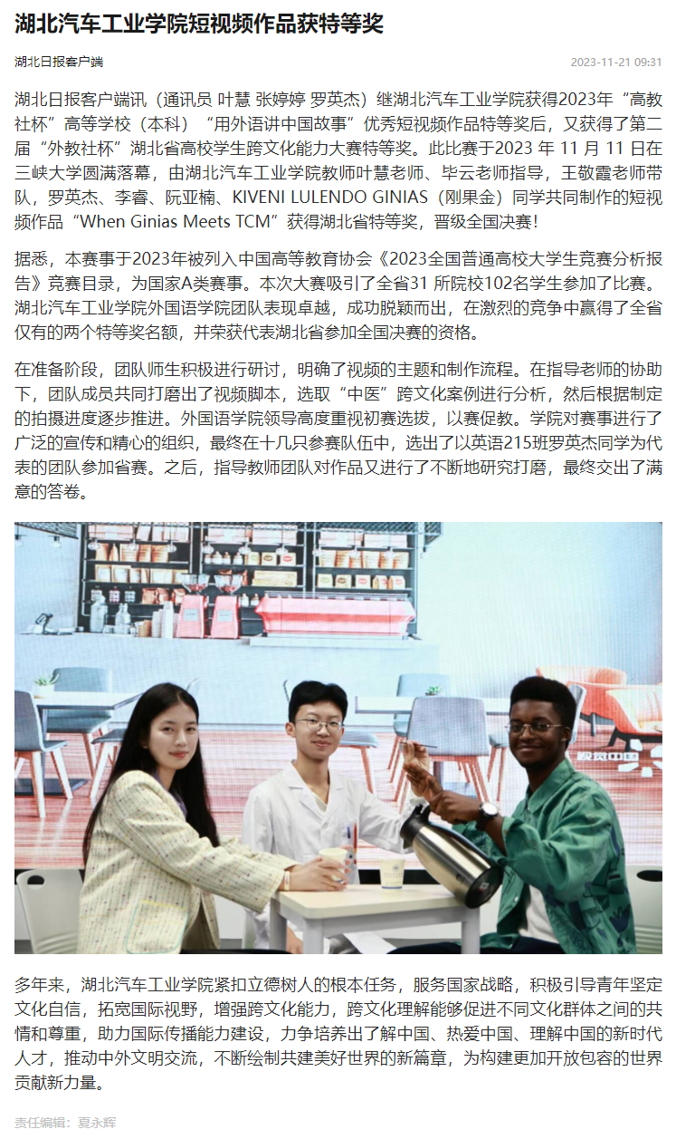【湖北日报】湖北汽车工业学院短视频作品获特等奖