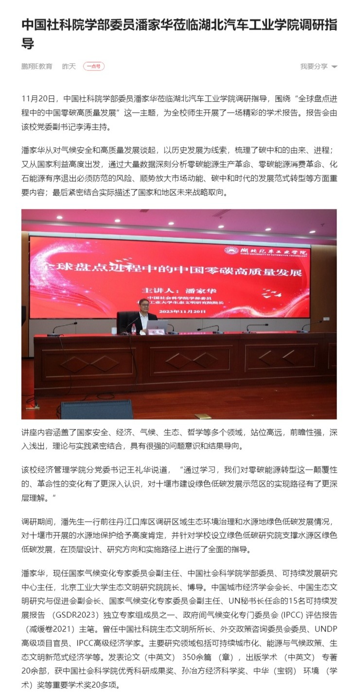【一点资讯】中国社科院学部委员潘家华莅临湖北汽车工业学院调研指导