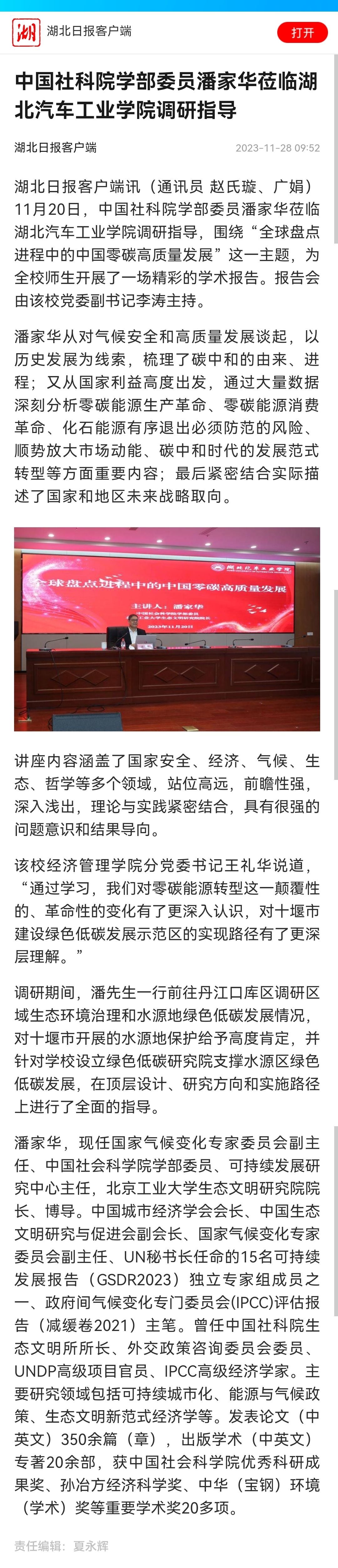 【湖北日报】中国社科院学部委员潘家华莅临湖北汽车工业学院调研指导