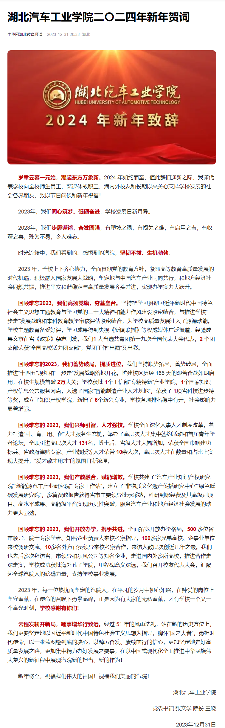 【中华网】湖北汽车工业学院二〇二四年新年贺词