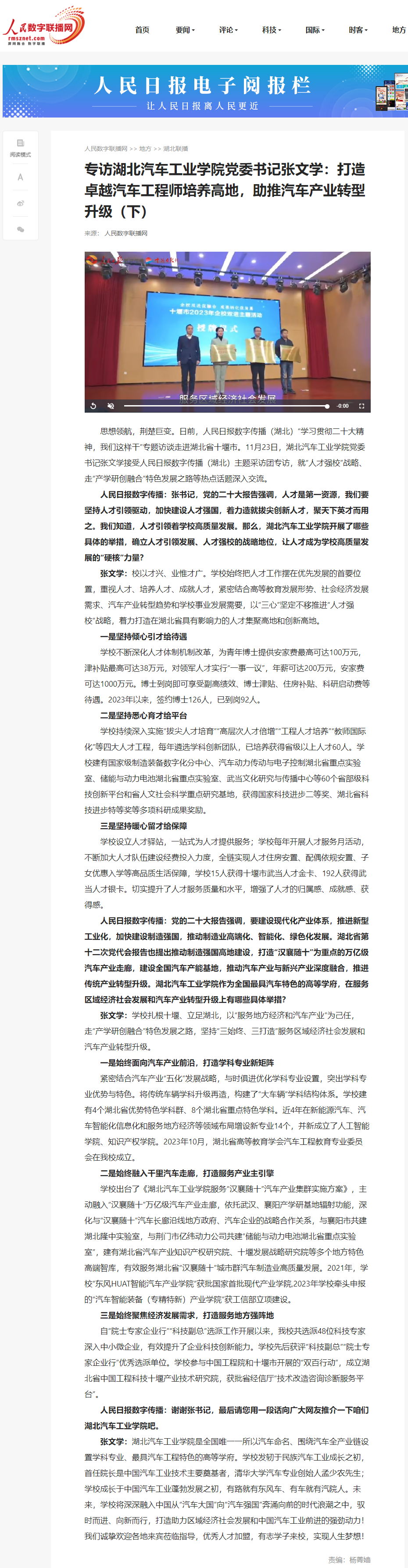 【人民日报】人民日报专访湖北汽车工业学院党委书记张文学:打造卓越汽车工程师培养高地,助推汽车产业转型升级(上)(下)