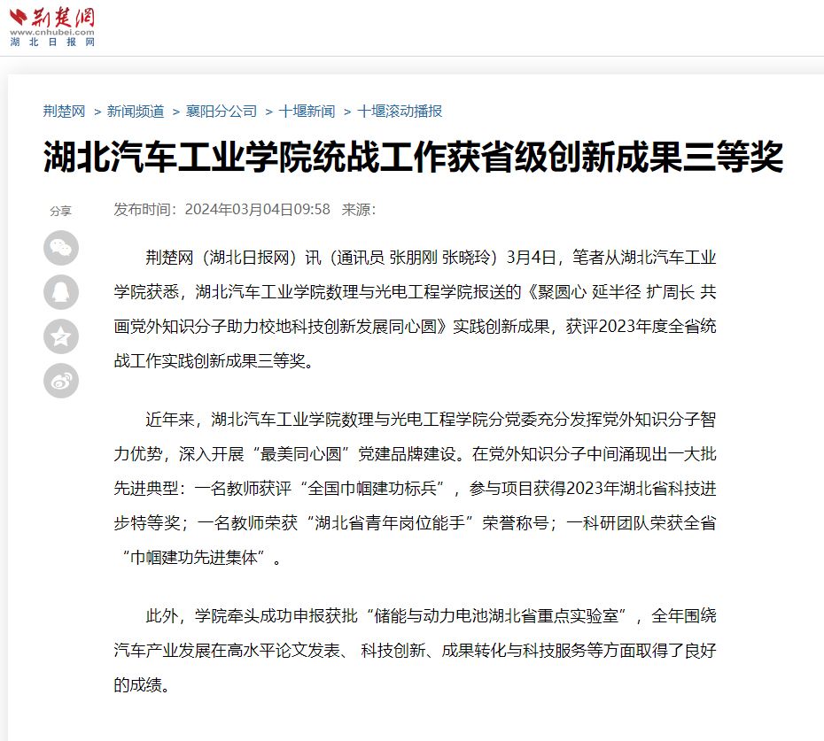 【荆楚网】湖北汽车工业学院统战工作获省级创新成果三等奖