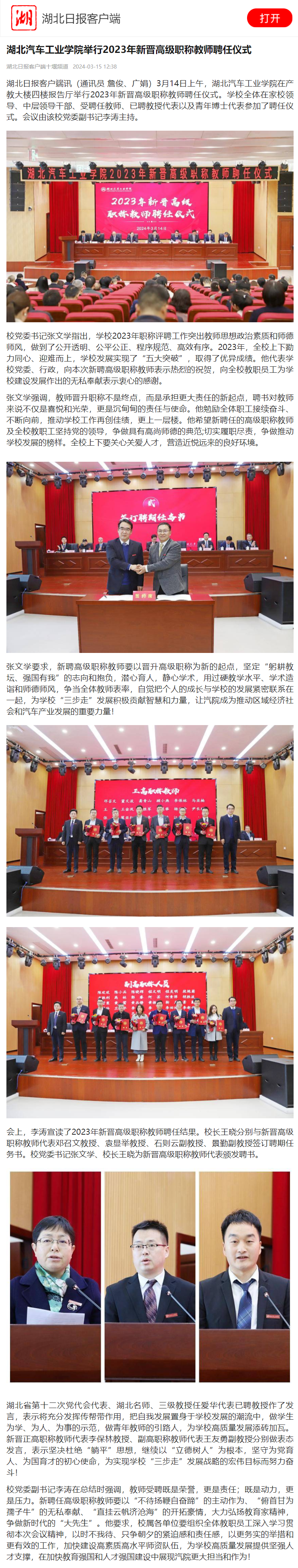 【湖北日报】湖北汽车工业学院举行2023年新晋高级职称教师聘任仪式