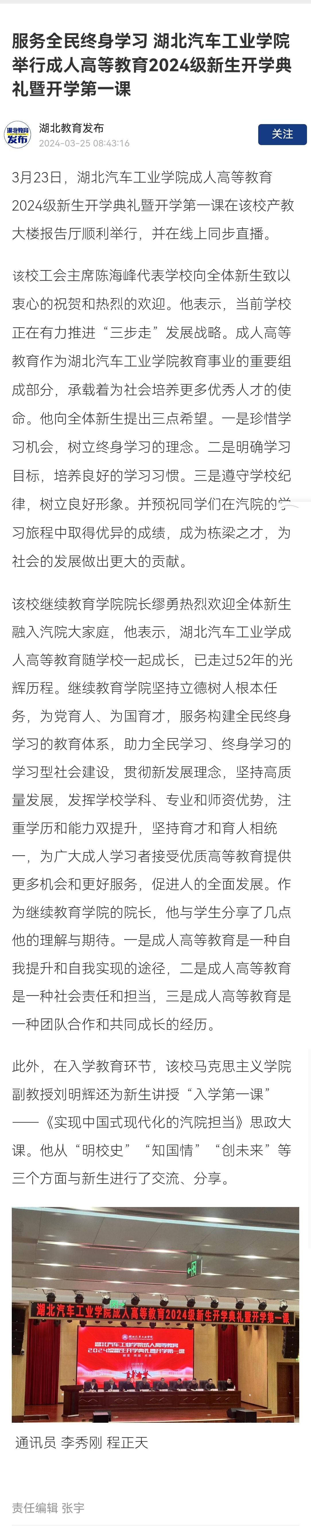 【长江云】湖北汽车工业学院举行成人高等教育2024级新生开学典礼暨开学第一课