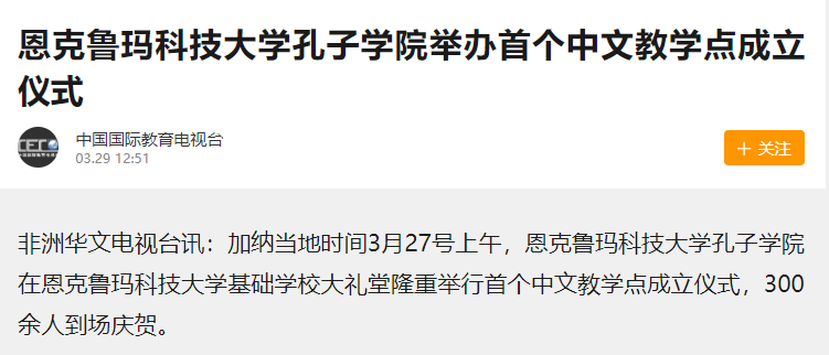 【中国国际教育电视台】恩克鲁玛科技大学孔子学院举办首个中文教学点成立仪式