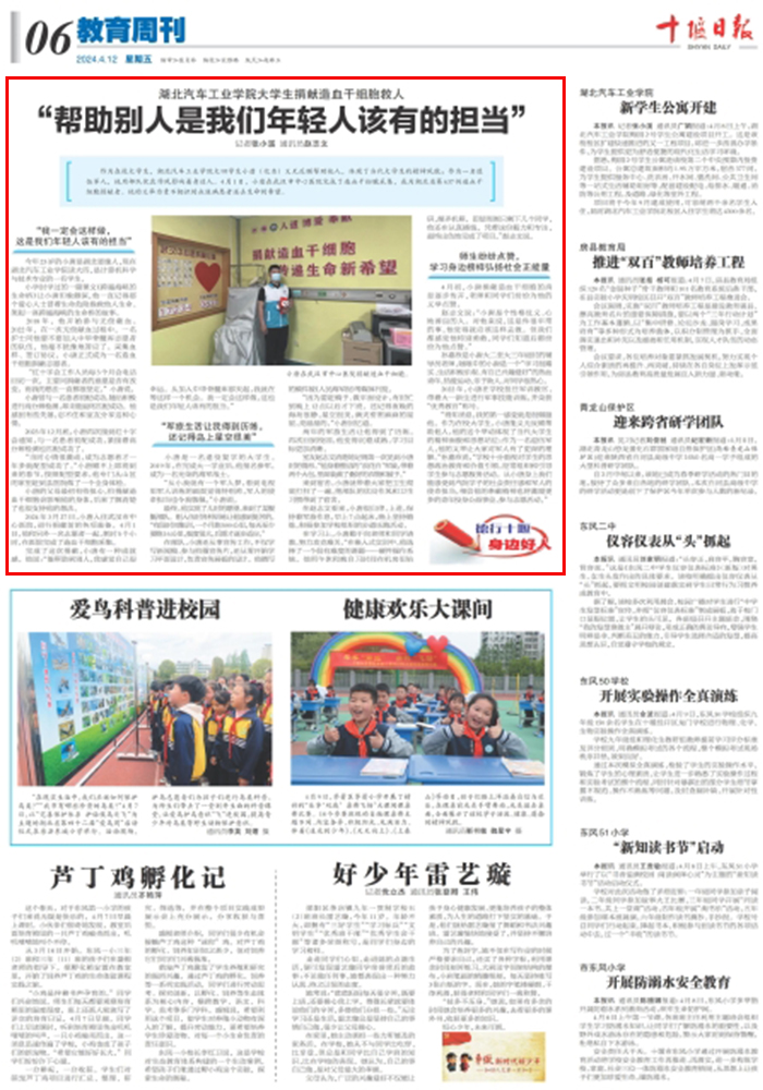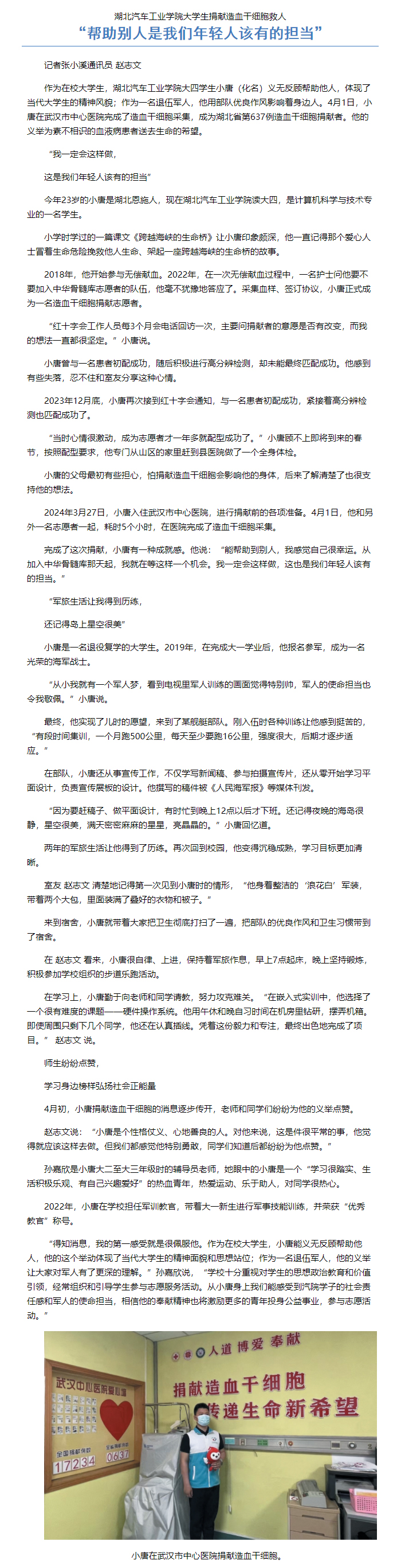 【十堰日报】湖北汽车工业学院大学生捐献造血干细胞救人“帮助别人是我们年轻人该有的担当”