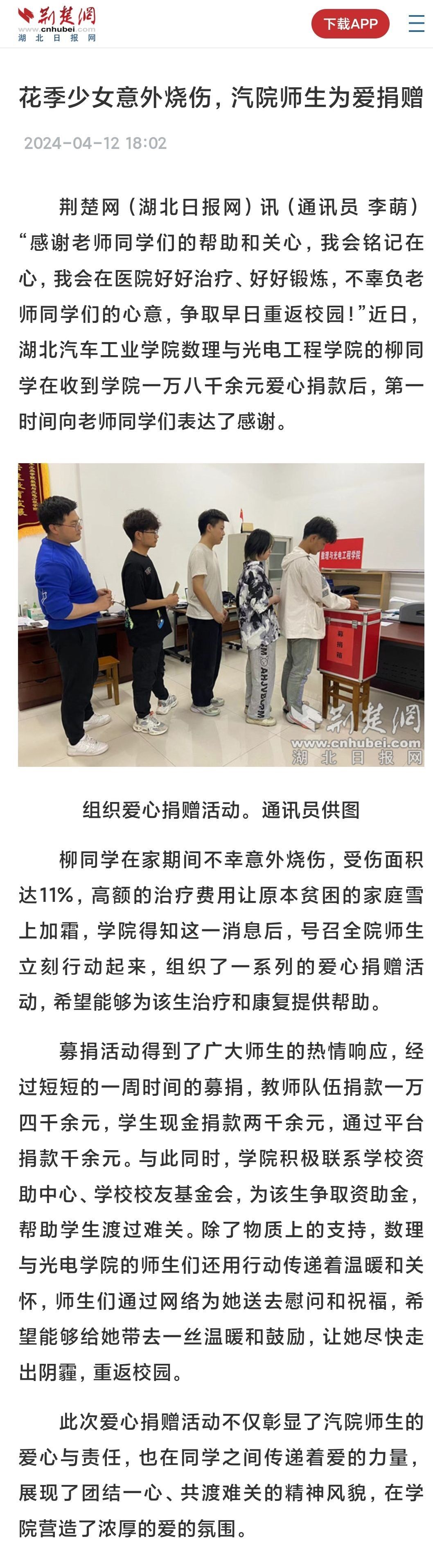 【荆楚网】花季少女意外烧伤,汽院师生为爱捐赠