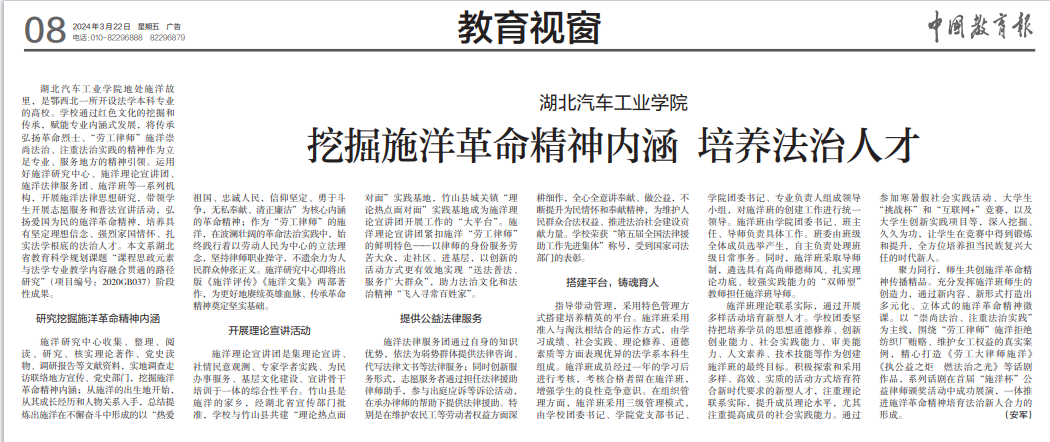 【中国教育报】湖北汽车工业学院:挖掘施洋革命精神内涵 培养法治人才