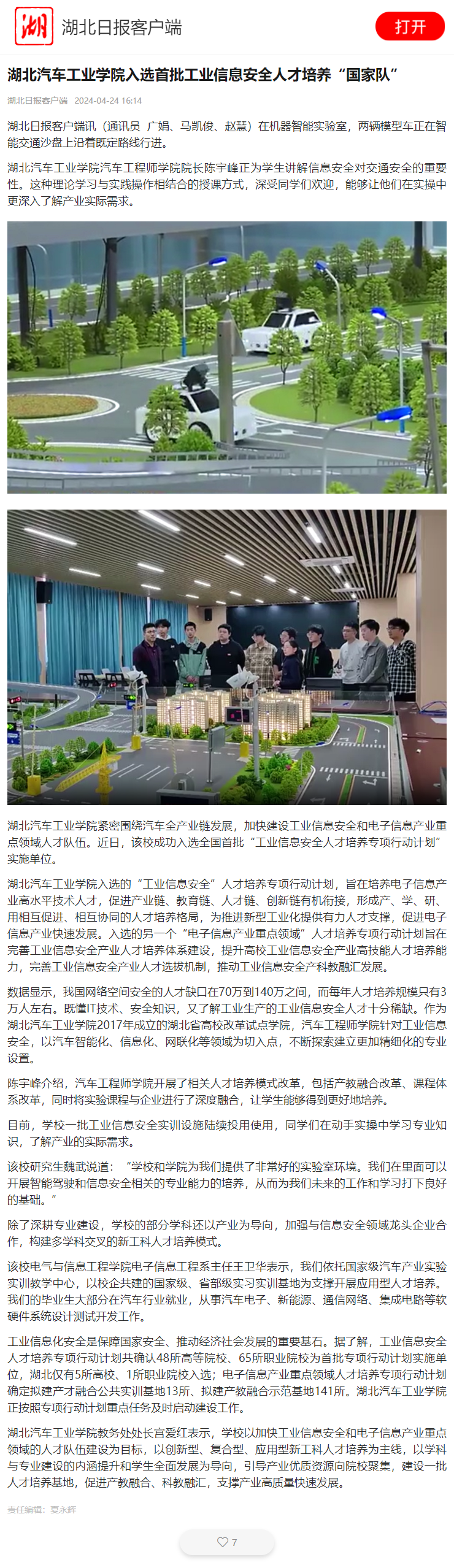 【湖北日报】湖北汽车工业学院入选首批工业信息安全人才培养“国家队”