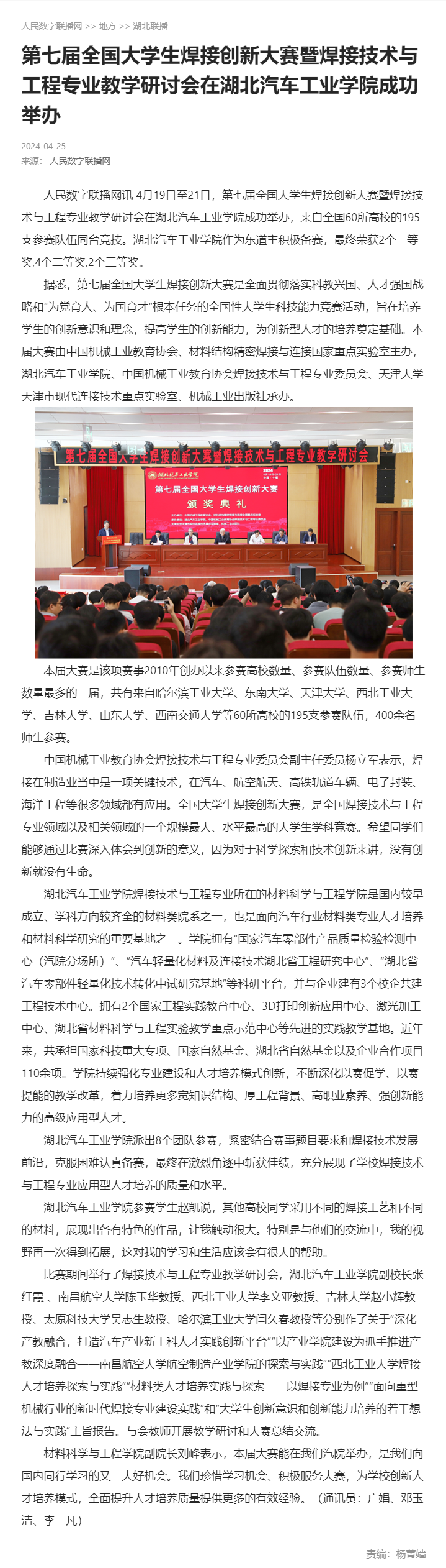 【人民数字联播网】第七届全国大学生焊接创新大赛暨焊接技术与工程专业教学研讨会在湖北汽车工业学院成功举办