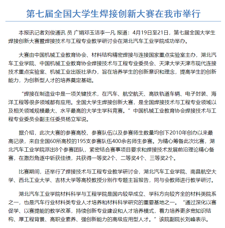 【十堰日报】第七届全国大学生焊接创新大赛在我市举行