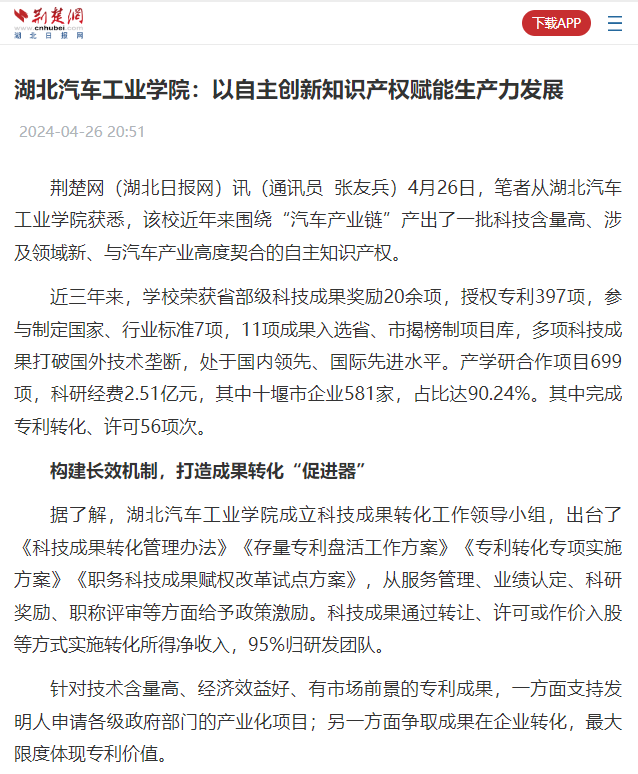 【荆楚网】湖北汽车工业学院:以自主创新知识产权赋能生产力发展
