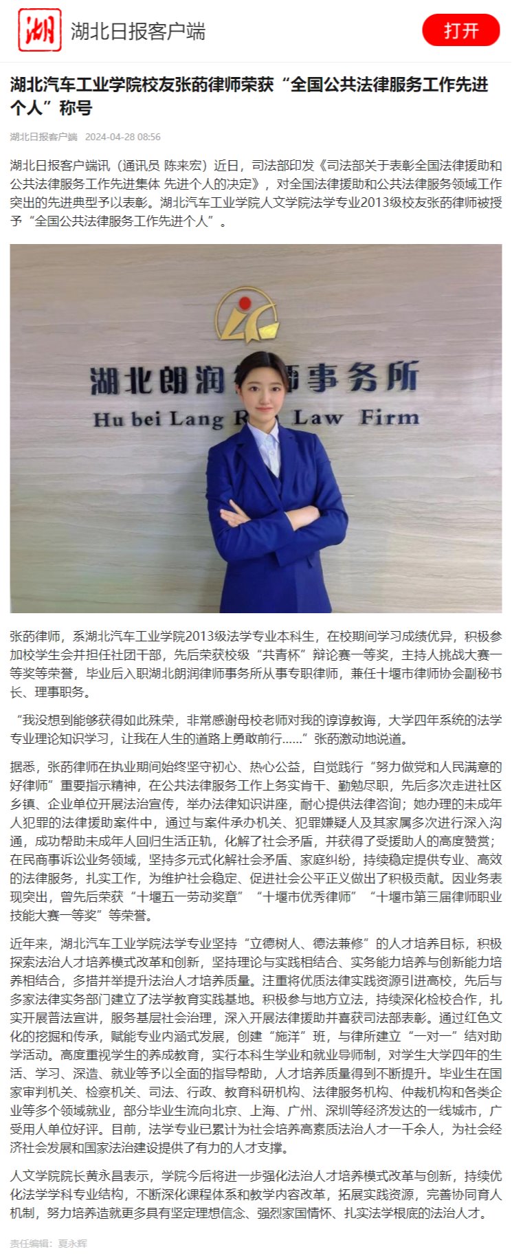 【湖北日报】湖北汽车工业学院校友张菂律师荣获“全国公共法律服务工作先进个人”称号