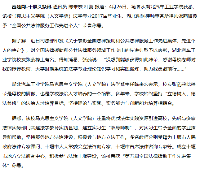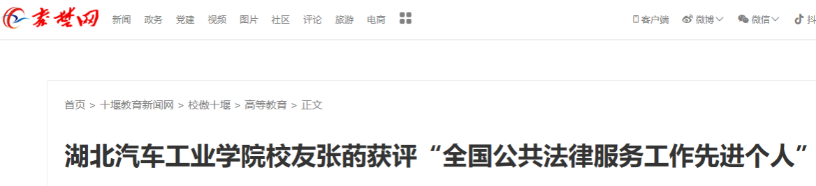 【秦楚网】湖北汽车工业学院校友张菂获评“全国公共法律服务工作先进个人”