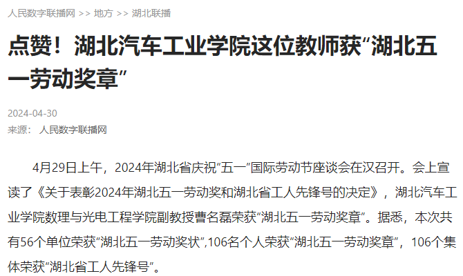 【人民日报数字联播】点赞!湖北汽车工业学院这位教师获“湖北五一劳动奖章”