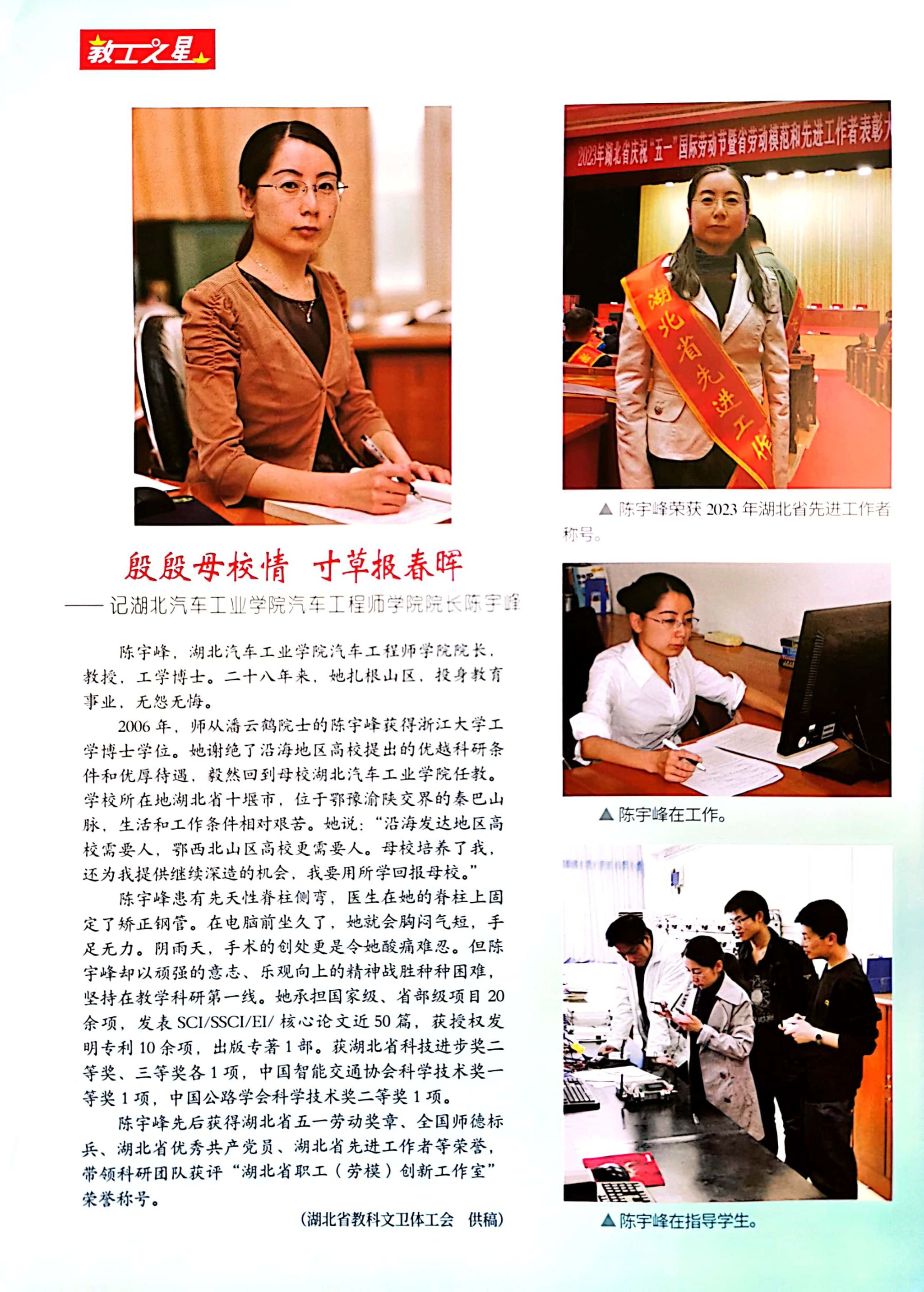 陈宇峰,湖北汽车工业学院汽车工程师学院院长,教授,工学博士。二十八年来,她扎根山区,投身教育事业,无怨无悔。