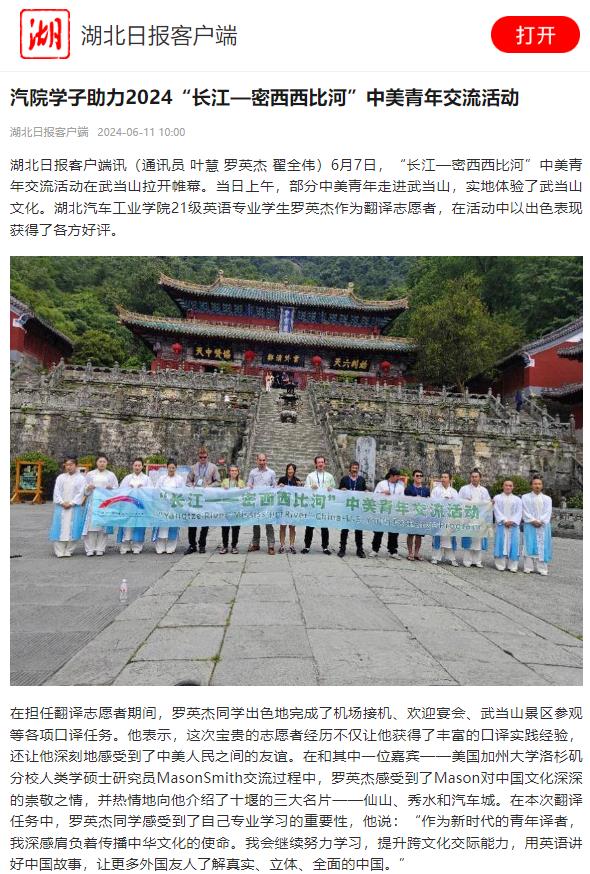 【湖北日报】汽院学子助力2024“长江—密西西比河”中美青年交流活动