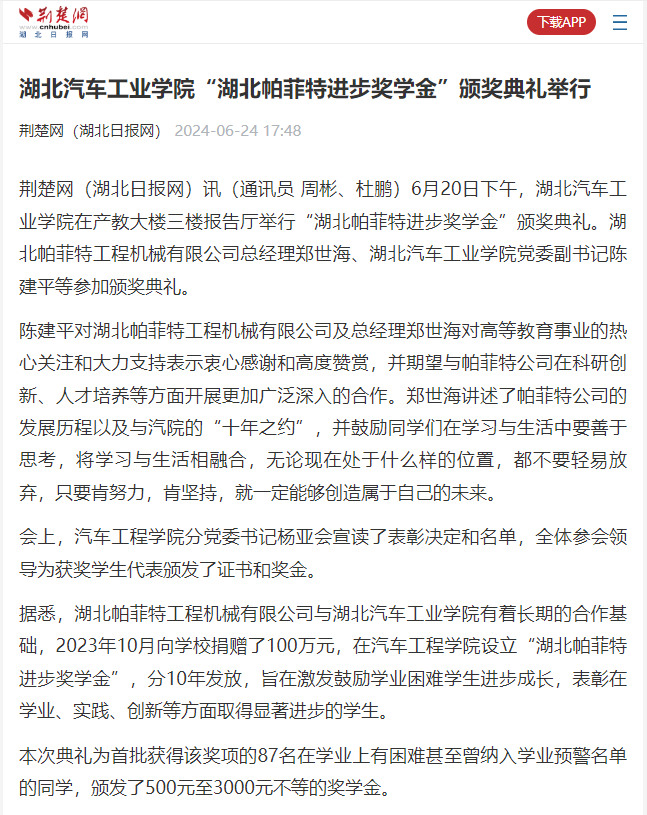 【荆楚网】湖北汽车工业学院“湖北帕菲特进步奖学金”颁奖典礼举行
