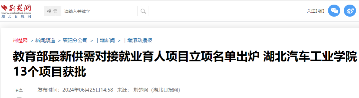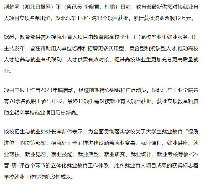【荆楚网】教育部最新供需对接就业育人项目立项名单出炉 湖北汽车工业学院13个项目获批