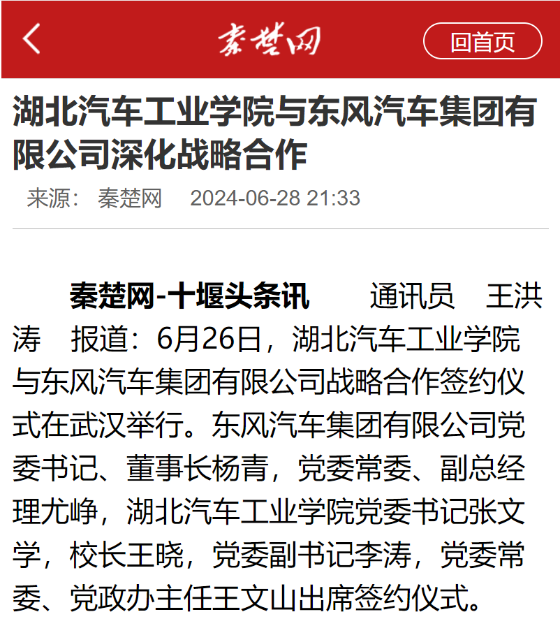 【秦楚网】湖北汽车工业学院与东风汽车集团有限公司深化战略合作