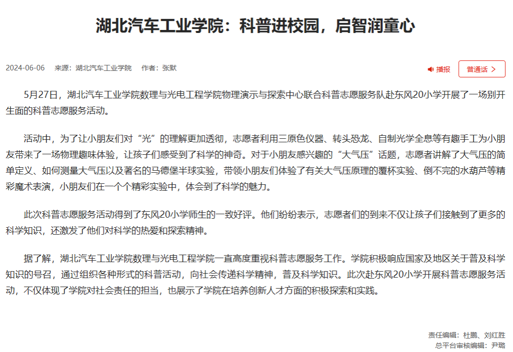 【学习强国总平台】湖北汽车工业学院:科普进校园,启智润童心