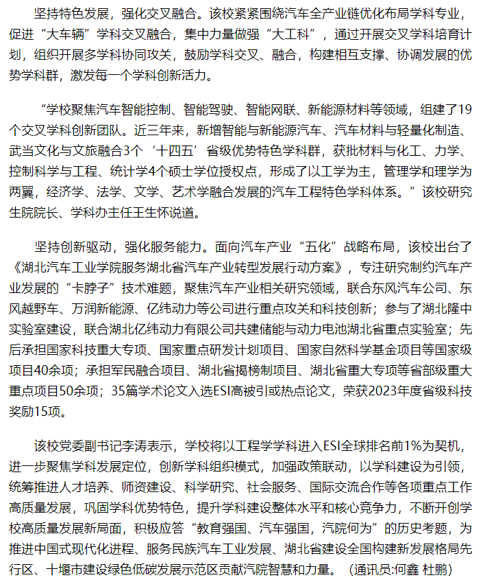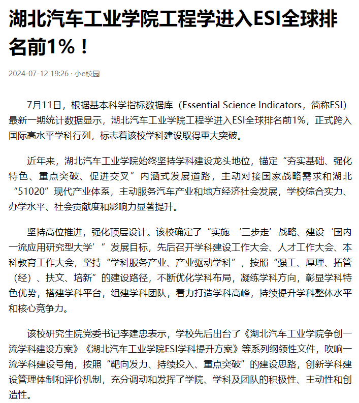 【今日头条】湖北汽车工业学院工程学进入ESI全球排名前1% !