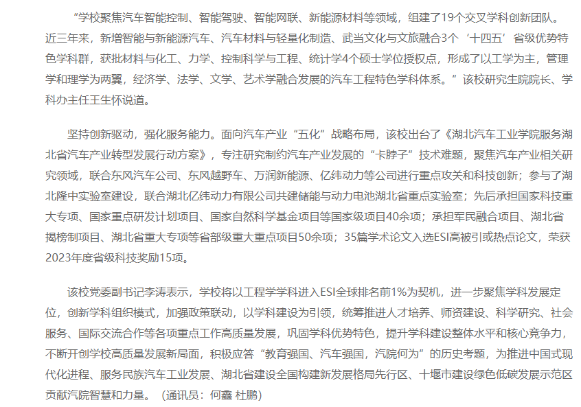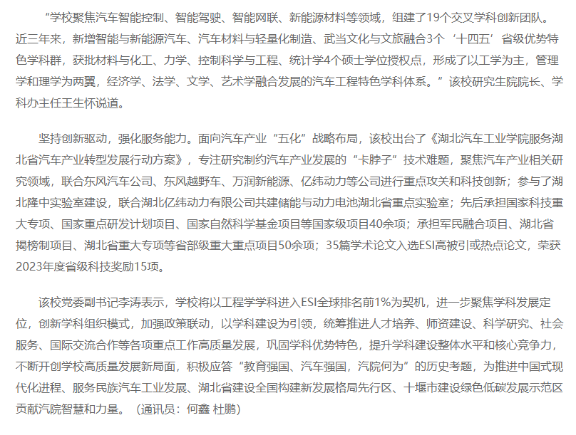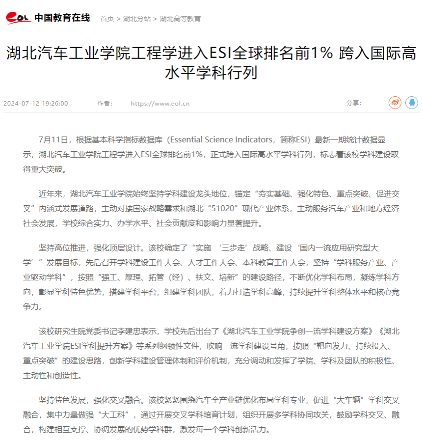 【中国教育在线】湖北汽车工业学院工程学进入ESI全球排名前1% 跨入国际高水平学科行列