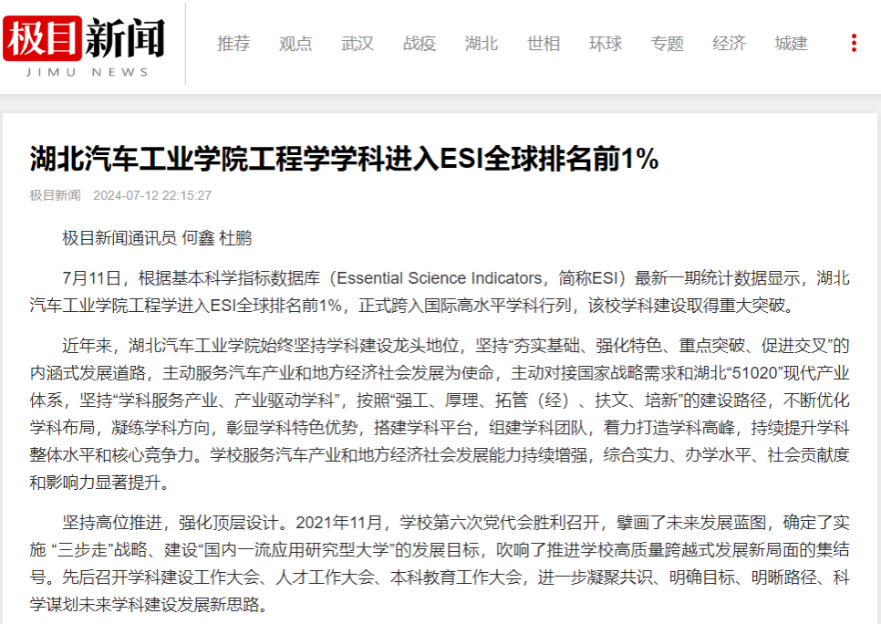 【极目新闻】湖北汽车工业学院工程学学科进入ESI全球排名前1%