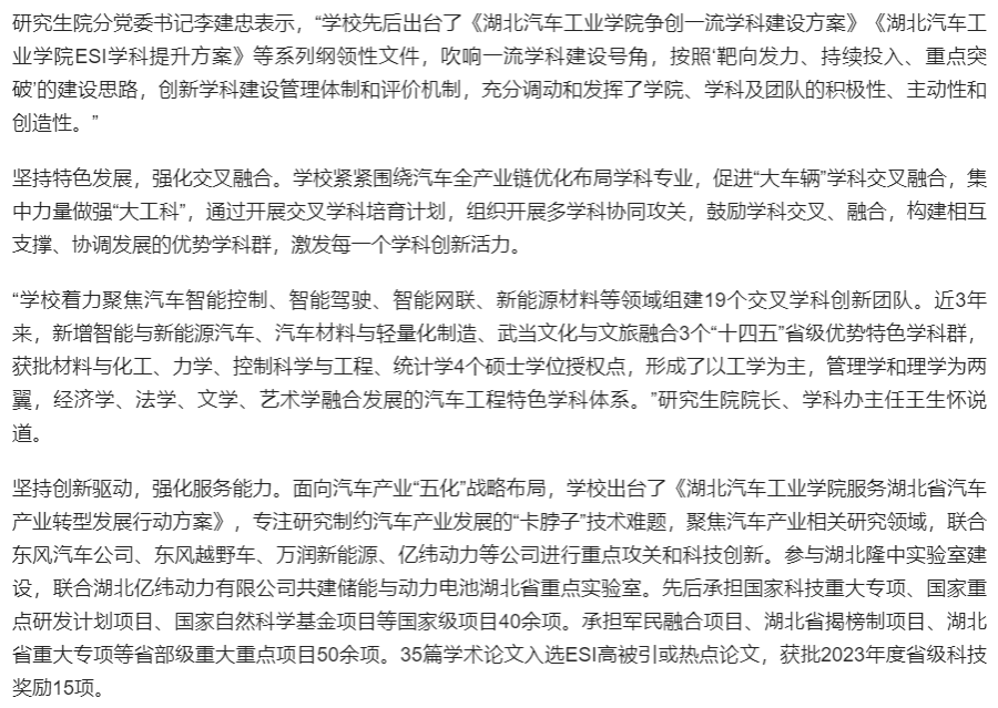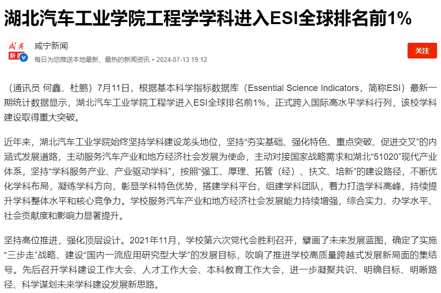 【咸宁新闻】湖北汽车工业学院工程学学科进入ESI全球排名前1%