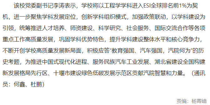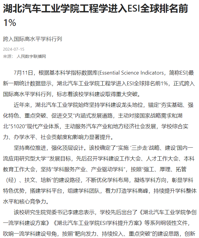 【人民日报数字传播】湖北汽车工业学院工程学进入ESI全球排名前1%