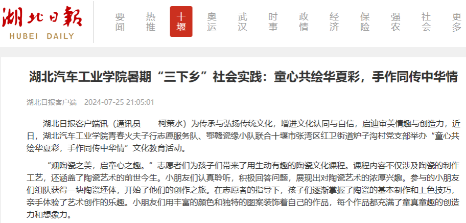 【湖北日报】湖北汽车工业学院暑期“三下乡”社会实践:童心共绘华夏彩,手作同传中华情