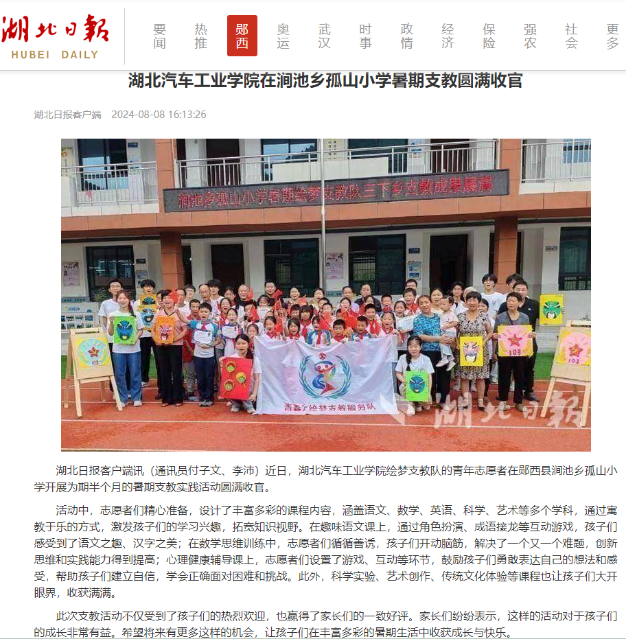【湖北日报】湖北汽车工业学院在涧池乡孤山小学暑期支教圆满收官