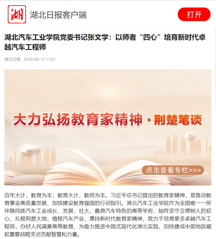 【湖北日报】湖北汽车工业学院党委书记张文学:以师者“四心”培育新时代卓越汽车工程师