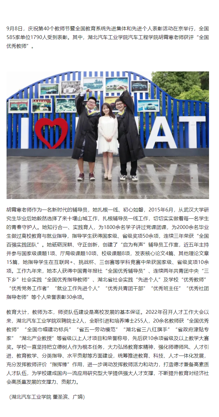 【一点资讯】祝贺!湖北汽车工业学院胡霄寒老师获评“全国优秀教师”