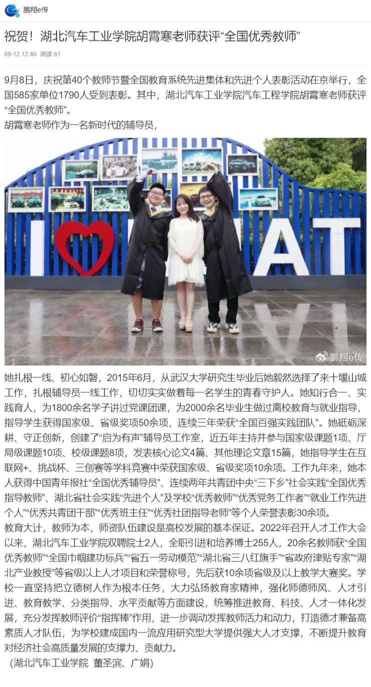 【微博】祝贺!湖北汽车工业学院胡霄寒老师获评“全国优秀教师”