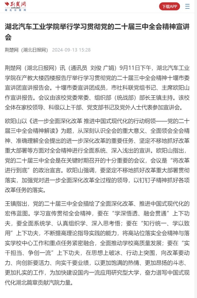【荆楚网】湖北汽车工业学院举行学习贯彻党的二十届三中全会精神宣讲会