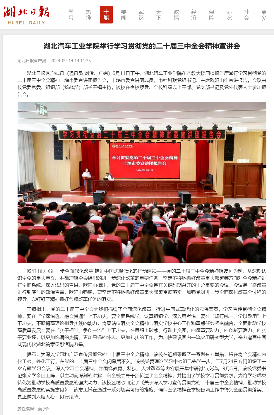 【湖北日报】湖北汽车工业学院举行学习贯彻党的二十届三中全会精神宣讲会