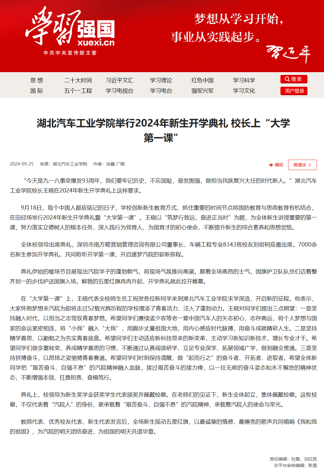 【学习强国平台】湖北汽车工业学院举行2024年新生开学典礼 校长上“大学第一课”