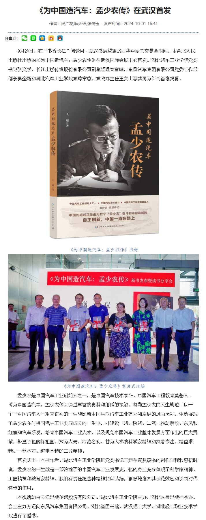 【中国新闻出版网】《为中国造汽车:孟少农传》在武汉首发