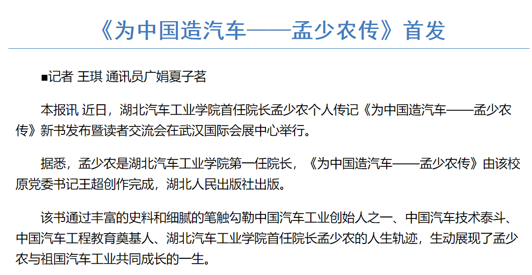 【十堰晚报】《为中国造汽车——孟少农传》首发