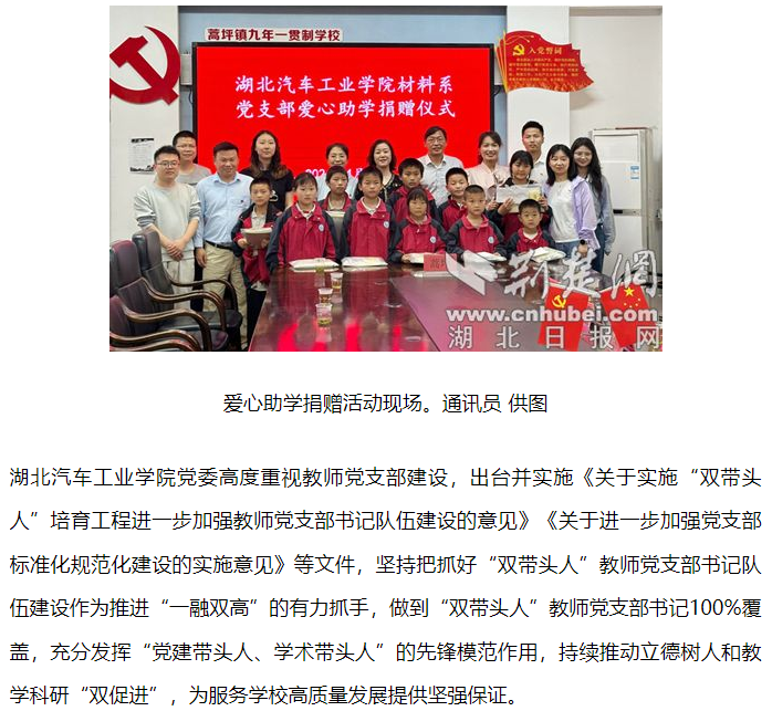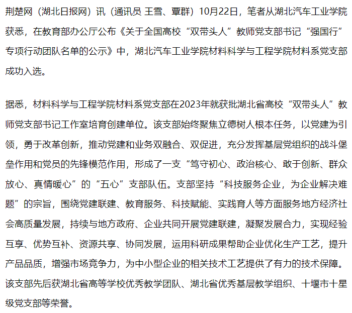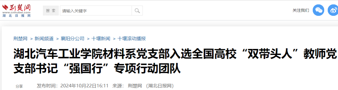 【荆楚网】湖北汽车工业学院材料系党支部入选全国高校“双带头人”教师党支部书记“强国行”专项行动团队