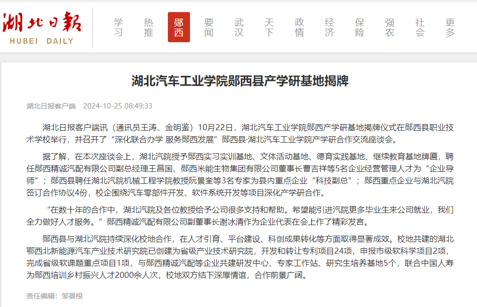 【湖北日报】湖北汽车工业学院郧西县产学研基地揭牌
