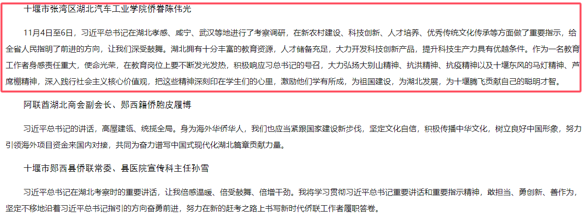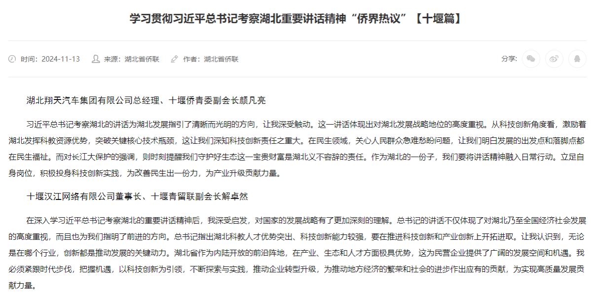 【湖北省侨联】学习贯彻习近平总书记考察湖北重要讲话精神“侨界热议”【十堰篇】