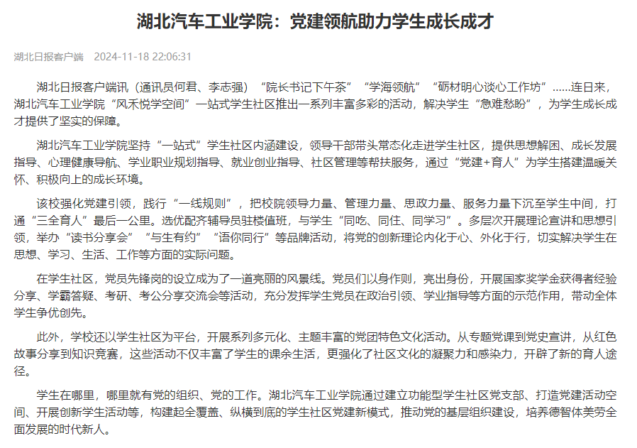 【湖北日报】湖北汽车工业学院:党建领航助力学生成长成才