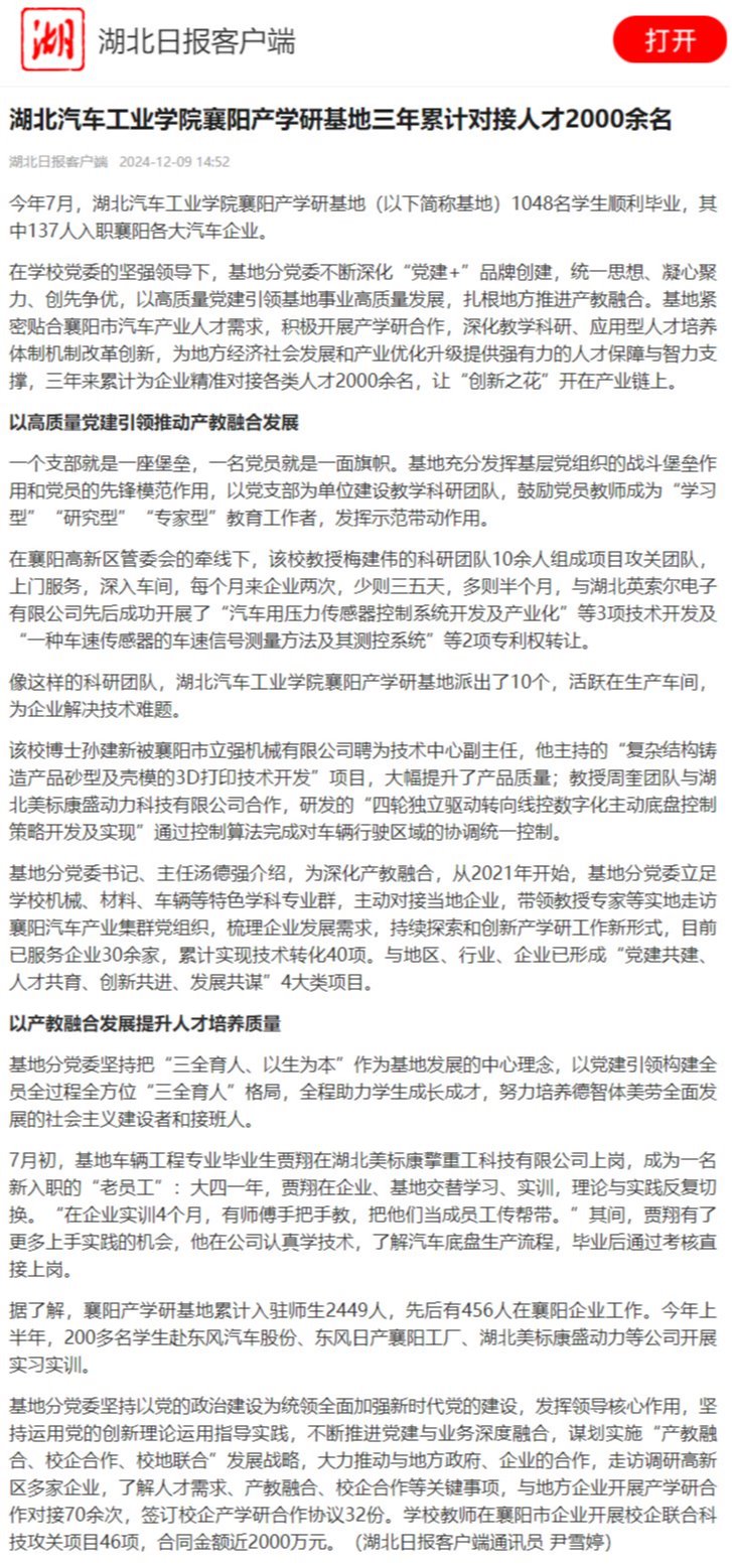 【湖北日报】湖北汽车工业学院襄阳产学研基地三年累计对接人才2000余名