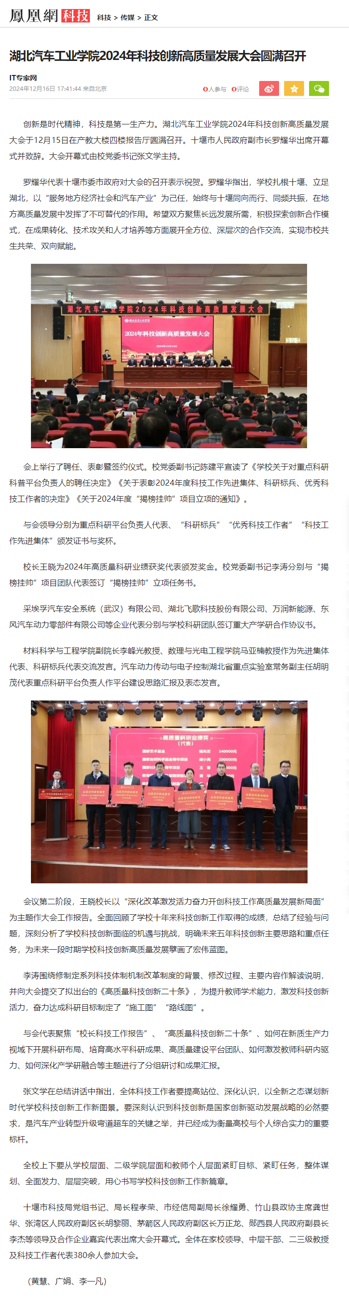 【凤凰网】湖北汽车工业学院2024年科技创新高质量发展大会圆满召开